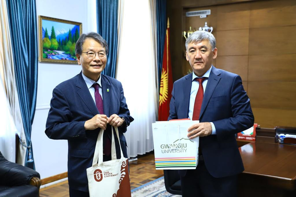 ОшМУга Түштүк Кореянын Кванджу университетинин ректору Чон Чжон Хван баштаган делегация келди. Алар менен ректор Кудайберди Кожобеков жолугуп, өз ара байланыштар, алдыдагы кызматташуунун перспективалары боюнча пикир алышты.