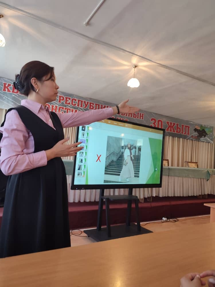 Аялдар кеңеши тарабынан түзүлгөн графикке ылайык окуу жайдын факультеттеринде жана колледждеринде “Студент кыздардын окуу жайда жана коомдук жайларда өзүн алып жүрүүсү” деген аталыштагы маалымат берүү иш-чаралары жүрүп жатат.
