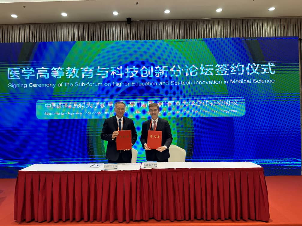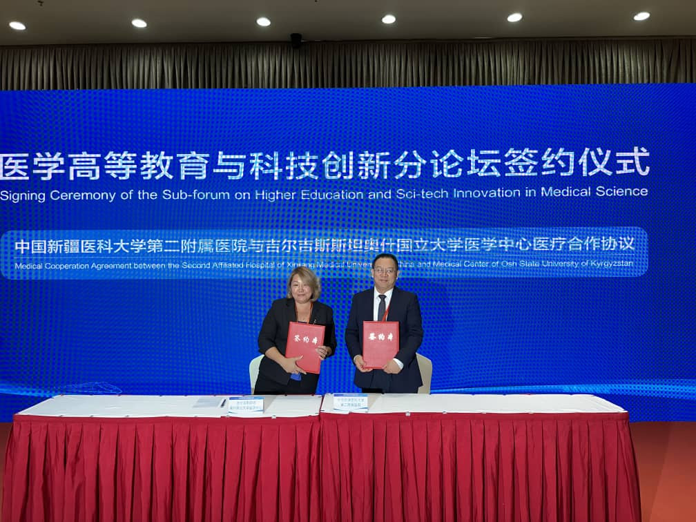 Билим берүү жана медицина тармагындагы эл аралык алмашуу жана кызматташтык боюнча форумдун алкагында Синьцзян медициналык университети менен Ош мамлекеттик университетинин, Синьцзян университетинин бейтапканасы менен ОшМУнун медициналык клиникасынын ортосунда медицина багытында жана Синьцзян педагогикалык университети менен кытай тилин окутуу жана өнүктүрүү багытында 3 меморандумга кол коюлду.