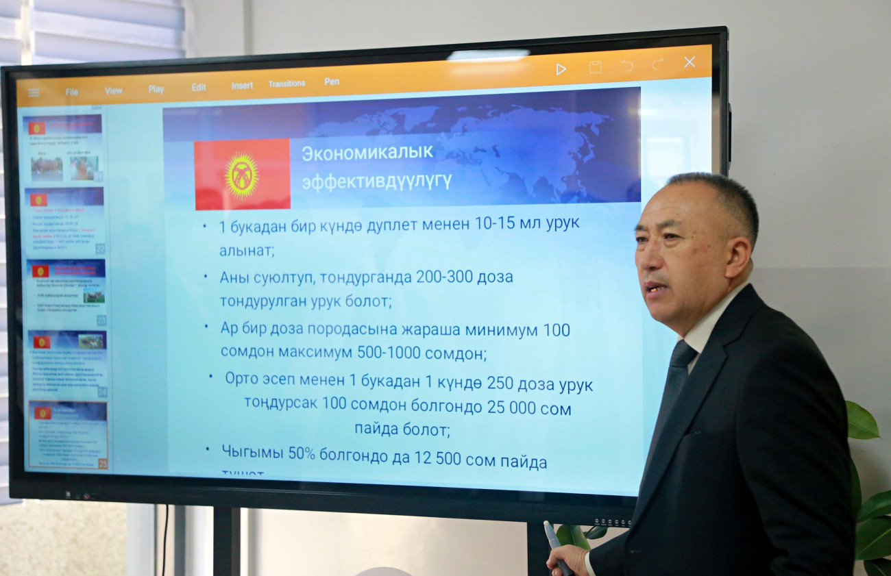 Имараттын кызыл тасмасы кесилип, келген коноктор ветеринардык клиниканын окуу-лабораториялык базасы менен таанышып, профессор А.Х. Абдурасуловдун “Асыл тукум иштери боюнча биотехнологиялык борбор” аттуу презентациясына күбө болушту.