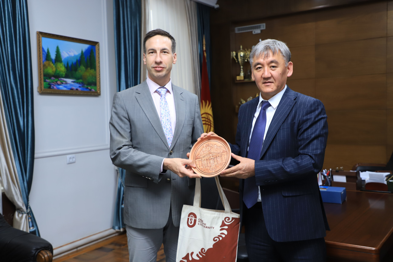 ОшМУнун Батыш Чех университетинин философия факультетинин деканы Давид Щанс баштаган делегация бүгүн, 31-октябрда ОшМУнун ректору Кудайберди Кожобеков менен жолугушту.