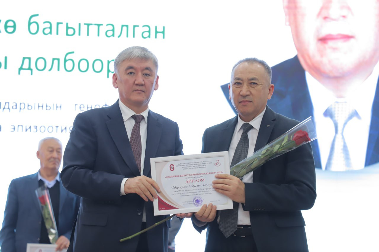 - «Өндүрүшкө багытталган мыкты долбоор-2025» номинациясы – Табият таануу, дене-тарбия, туризм жана агрардык технологиялар институтунун ветеринардык медицина жана биотехнология кафедрасынын профессору, айыл чарба илимдеринин доктору Абдугани Абдурасулов;
