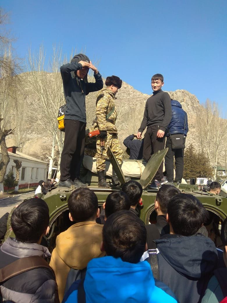 Анда студенттер жоокерлердин күнүмдүк турмушу, аскердик күжүрмөн техникалары, аскер куралдары менен жеринде таанышты.