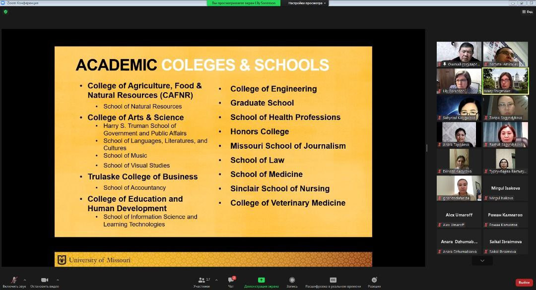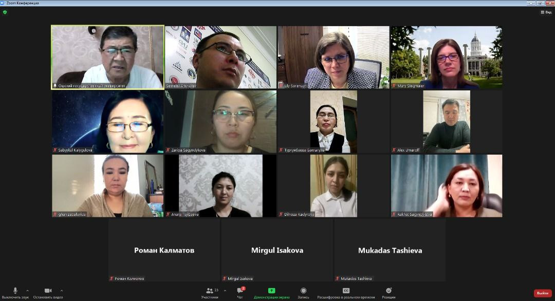 АКШдагы Миссури университети менен ОшМУнун тийиштүү жетекчилеринин ортосунда онлайн жолугушуу болду. Жыйынга аталган окуу жайдын эл аралык программалар боюнча вице-проректору, эл аралык борборунун директору, профессор Мэри Стегмайер жана анын жардамчылары, ал эми ОшМУдан эл аралык байланыштар департаментинин директору А. Абдувалиев, тиешелүү факультеттердин декандары, структура жетекчилери, студенттер катышты.