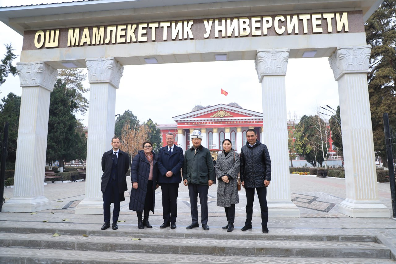 Посол встретился с проректором по учебной работе ОшГУ Нурланом Омуровым. Стороны обсудили вопросы сотрудничества вузов двух стран. Высокий гость также пригласил преподавателей ОшГУ принять участие в обмене опытом, который пройдет в 2024 году в университете Пуатье.