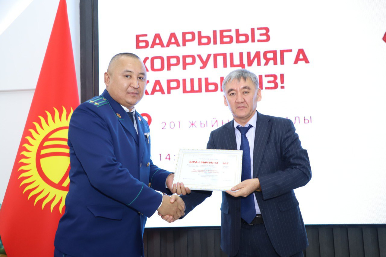 Сегодня, 11 декабря в ОшГУ прошло награждение победителей конкурса "Мы все против коррупции". На мероприятии приняли участие заместитель прокурора г.Ош Абдурашит Кубатидинов, ректор ОшГУ Кудайберди Кожобеков, представители вузов, управления культуры г. Ош, преподаватели и студенты высших и средних профессиональных учебных заведений, представители общественности и СМИ.