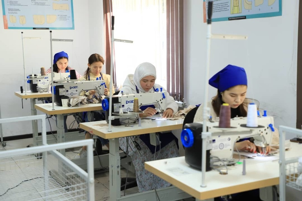 На первом этаже центра расположены швейные цеха, оборудование с программным управлением. Здесь установлены 42 современные машинки и лазерная машина, на которых студенты на практике обретают навыки и выполняют производственную работу. Так, студентами выполнено работ на сумму 2 млн сомов.