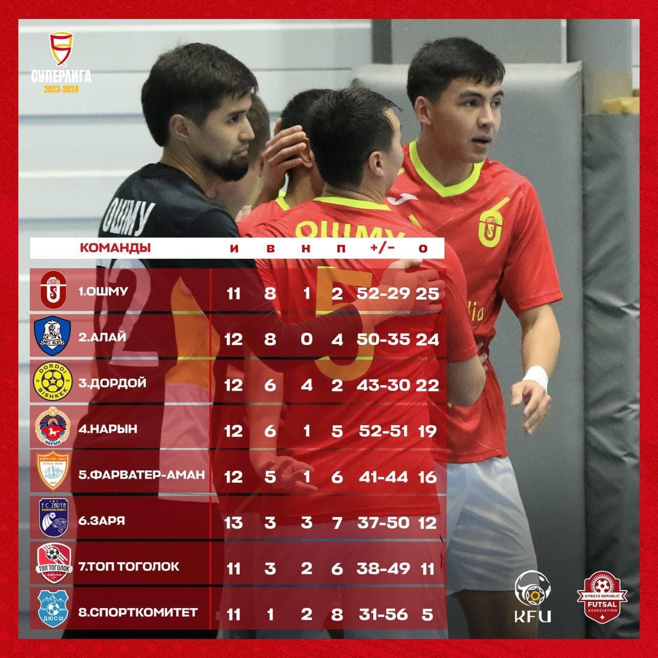 27 января завершились финальные встречи в предварительном туре Суперлиги страны. Команда по мини футболу ОшГУ "Университет" обыграла во втором круге команду "Спорткомитет” со счетом 13:7. "Университет", сохранив позицию лидера, получила путевку на полуфинал.