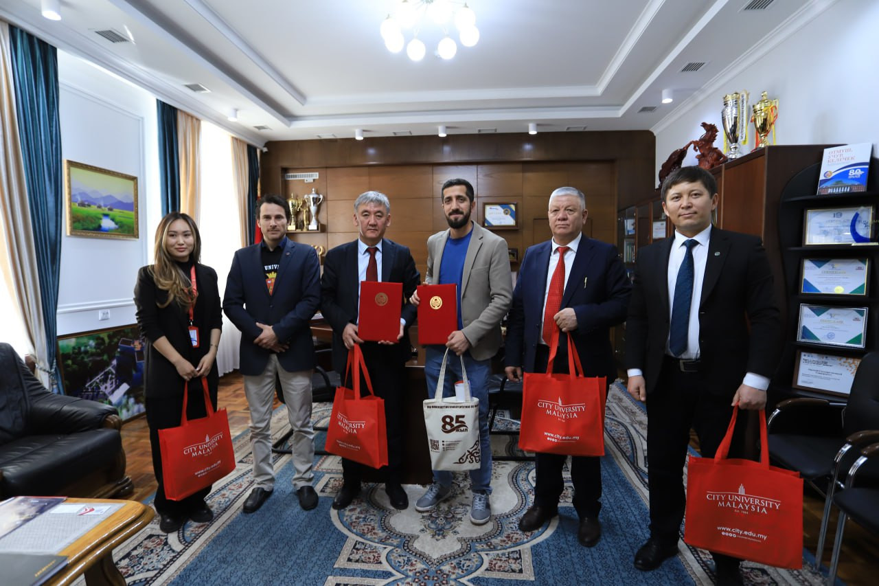 ОшГУ посетили представители CITY UNIVERSITY Малайзии - менеджер отдела международного маркетинга CITY UNIVERSITY Малайзии по Центральной Азии Фирузджон Гулов, исполнительный менеджер языкового центра университета Монтел Пьер Анри и директор компании Go Global в Кыргызстане университета Малайзии Тахмина Мурзакматова. Делегация встретилась с руководством ОшГУ во главе с ректором Кудайберди Кожобековым.