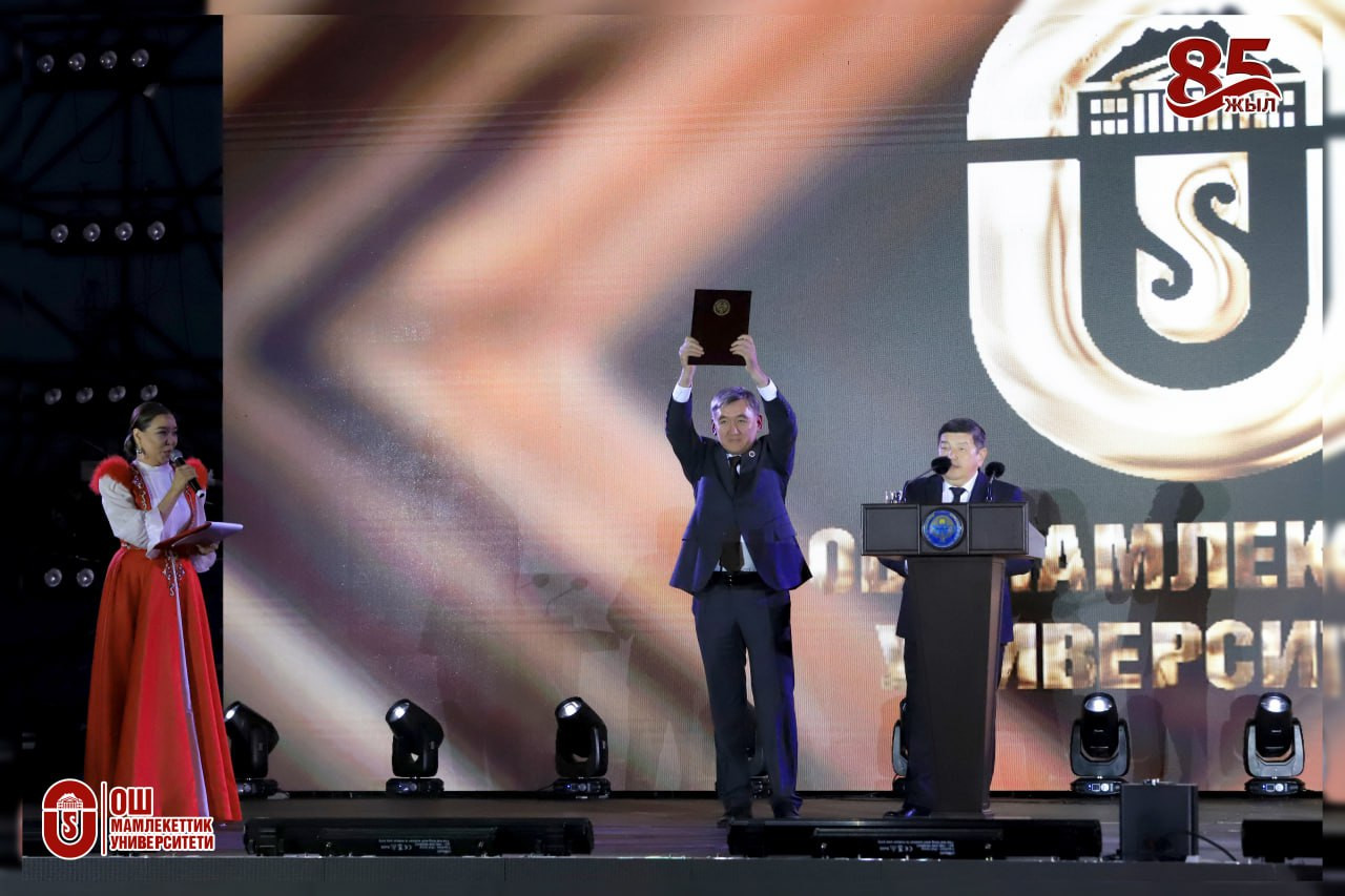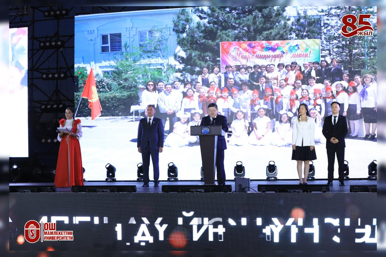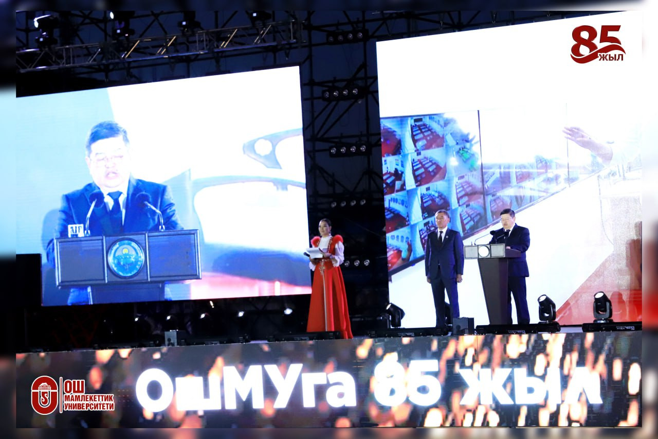 Поздравительную речь Президента страны Садыра Жапарова зачитал Председатель Кабинета Министров КР , Почетный профессор ОшГУ Акылбек Жапаров. В поздравлении отмечается, что ОшГУ является лидером среди университетов страны. Выпускники университета успешно трудятся как в стране, так и зарубежом, в разных сферах государственной службы, экономики, культуры, внося достойный вклад в развитие страны. Сегодня система образования стоит перед лицом вызовов, требующих неотложных реформ. В связи с этим пяти передовым вузам страны предоставлен особый статус, среди которых Ошский государственный университет. Особо было отмечено, что ОшГУ одним из первых в стране перешел на электронное обучение, цифровизацию. Университет успешно реализует инновационную систему образование-наука-производство-коммерциализация. Президент выразил веру, что преподавательский и студенческий коллектив ОшГУ, идя в ногу со временем, достигнет новых свершений.