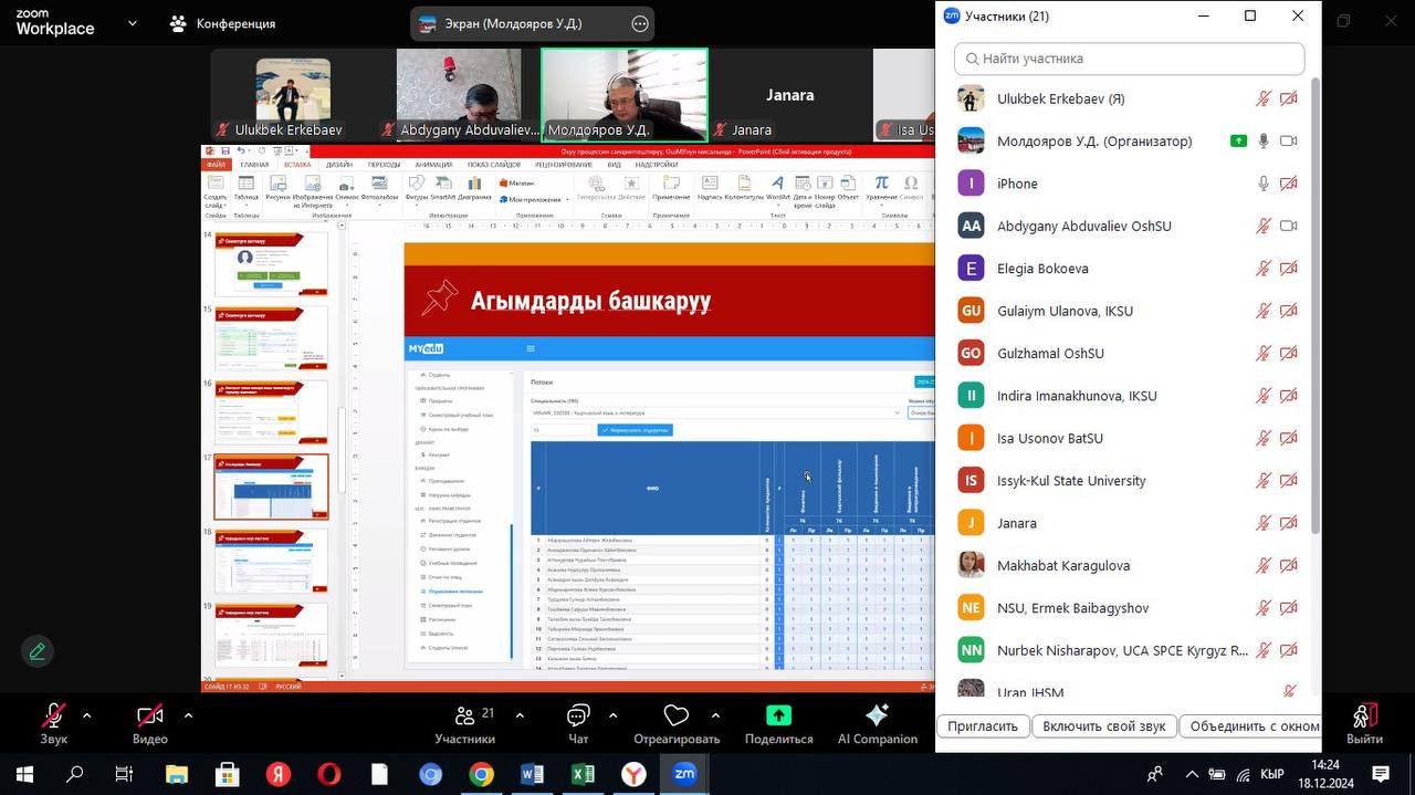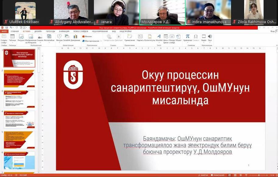 В рамках проекта программы Эразмус + "Зеленые и цифровые университеты к устойчивому развитию в Кыргызстане" в ОшГУ состоялось онлайн-совещание. В нем приняли участие более двадцати сотрудников учебных заведений, входящих в проектный консорциум. На заседании проректор университета по цифровой трансформации и электронному образованию Уларбек Молдояров выступил с презентацией на тему “Цифровизация учебного процесса на примере ОшГУ”. В своем выступлении он отметил, что цифровизация вузов позволит повысить эффективность работы студентов, преподавателей и администрации, а также улучшить качество образования. Участники отметили, что ОшГУ значительно опережает других в этом направлении, проводимая работа будет способствовать развитию других учебных заведений в этом направлении. Заседание провел координатор проекта в ОшГУ Абдыганы Абдувалиев.