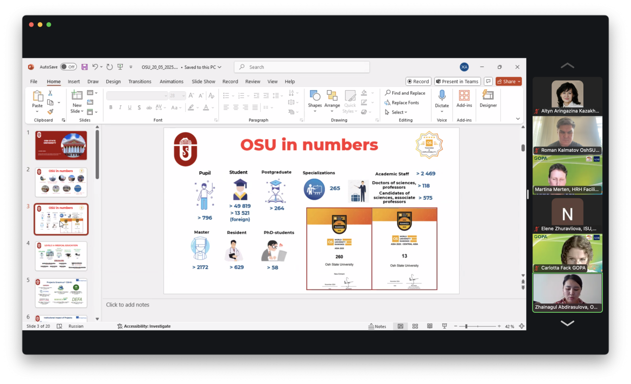 Такая информация была озвучена сегодня, 22 мая, на онлайн-конференции, организованной программой CAREC в области глобального здравоохранения. В мероприятии приняли участие декан международного медицинского факультета Ошского государственного университета Роман Калматов и руководители структур факультета. На встрече образовательные учреждения, выбранные в качестве «Центров передового опыта», представили информацию о своих достижениях и успехах.