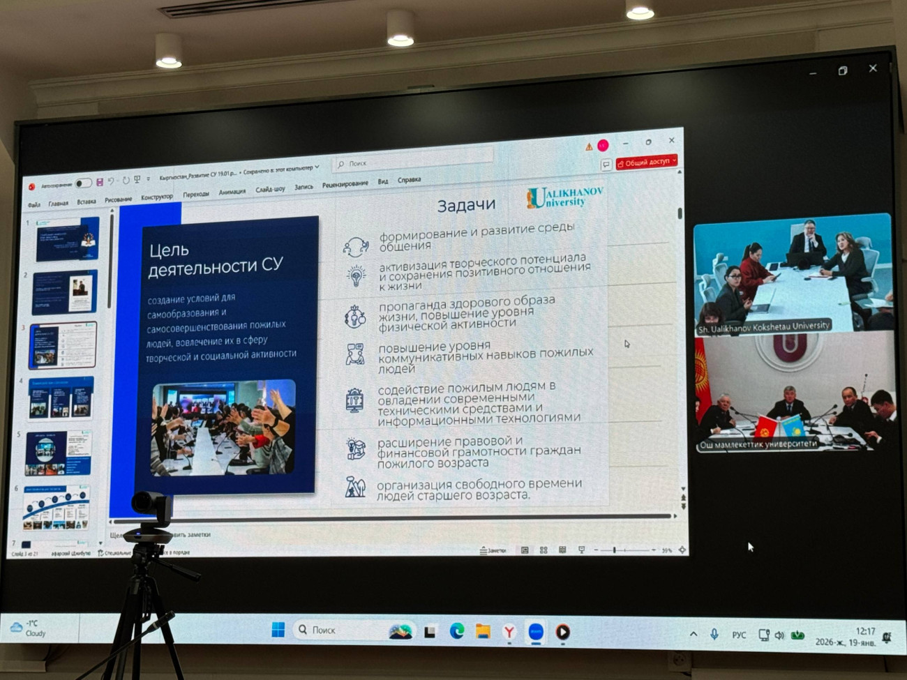 Ошский государственный университет (ОшГУ) провел презентацию проекта «Серебряный университет», реализуемого совместно с Кокшетауским университетом им. Ч. Валиханова в Казахстане. Во встрече, организованной в онлайн-формате, приняли участие ректоры обоих учебных заведений Кудайберди Кожобеков, Марат Сырлыбаев и проректоры.