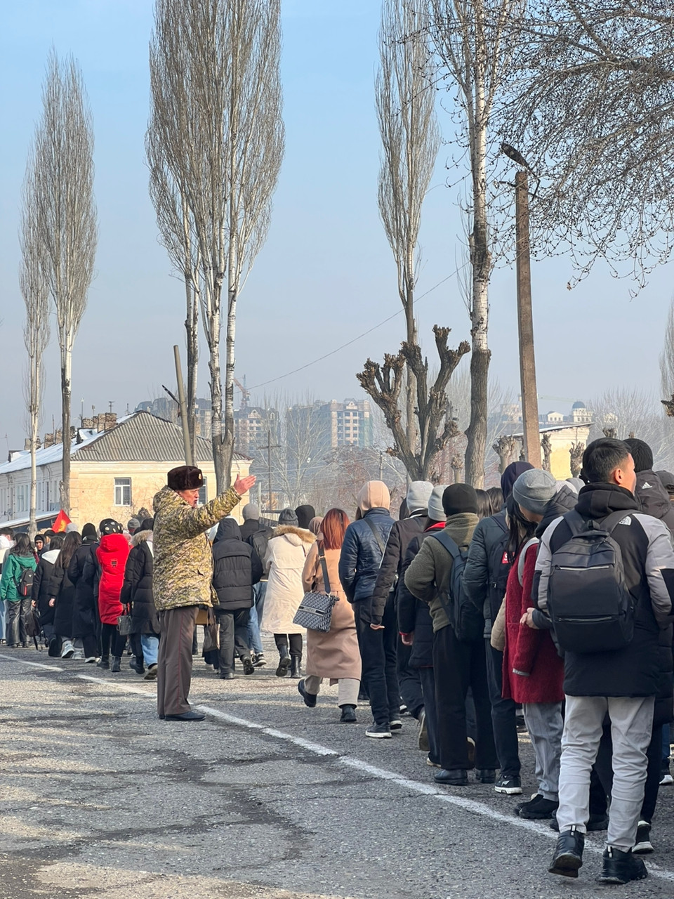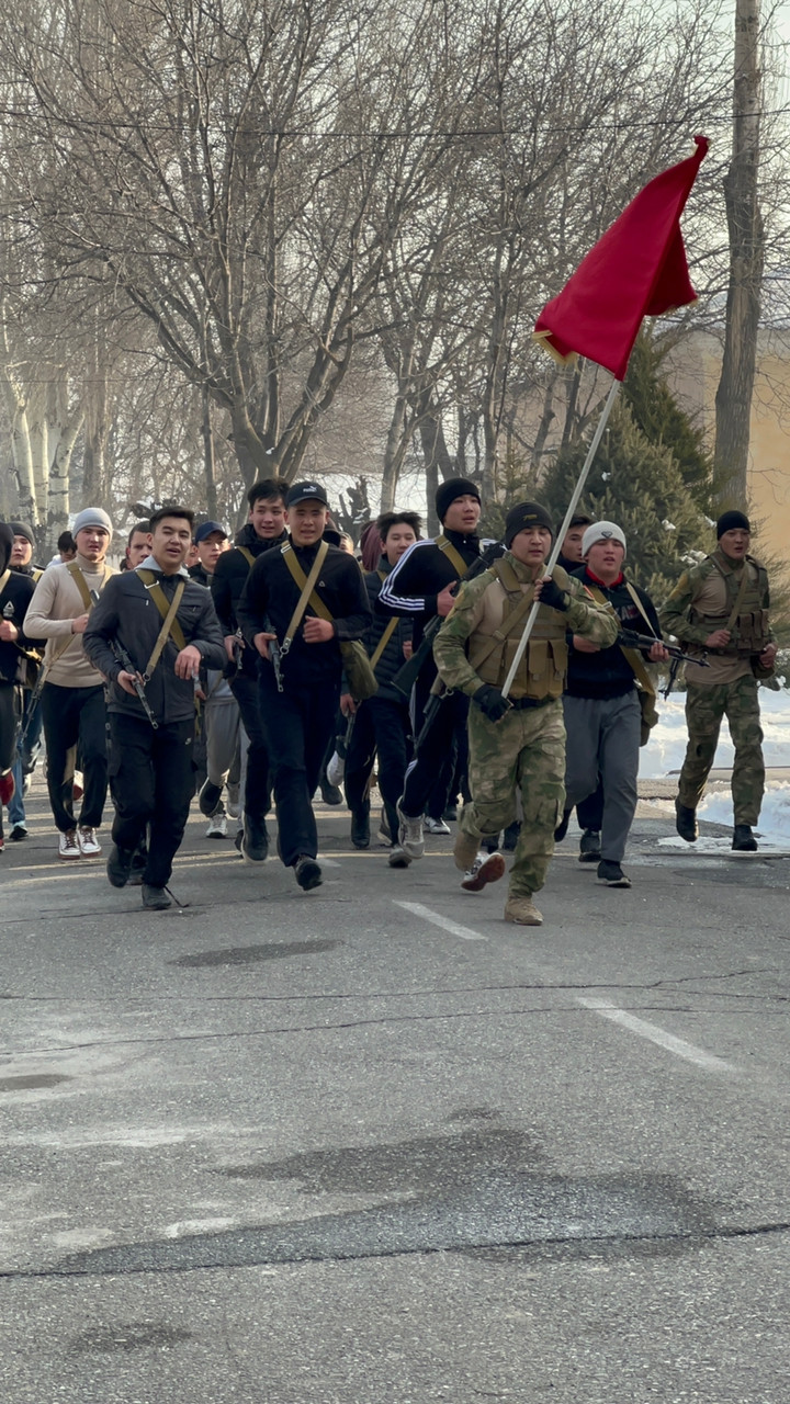 Oş Devlet Üniversitesi Uluslararası Bilimsel Programlar Koleji öğrencileri, Stalingrad Muharebesi’nin 80. yıl dönümü şerefine 36806 numaralı askeri birliği ziyaret ederek 5 kilometrelik yürüyüşe katıldı.