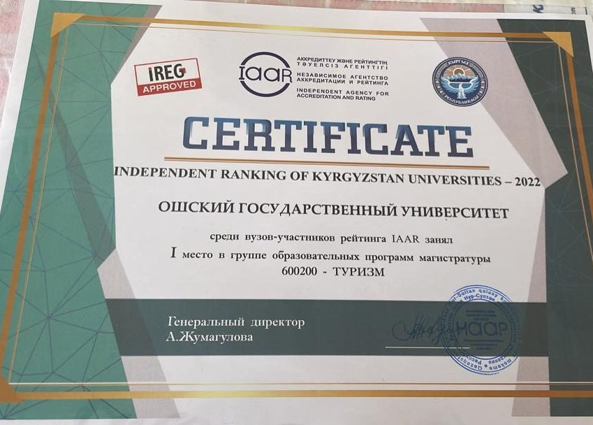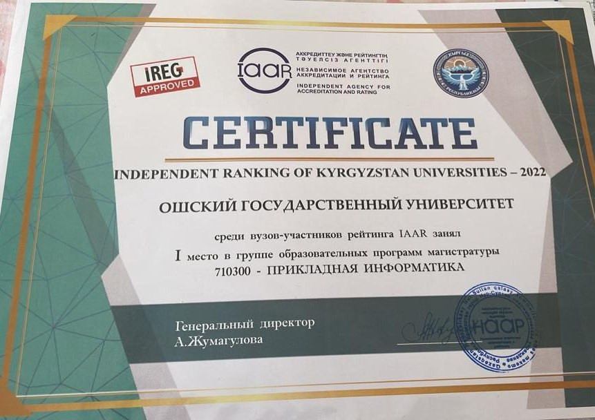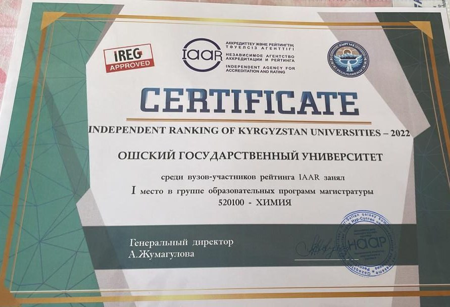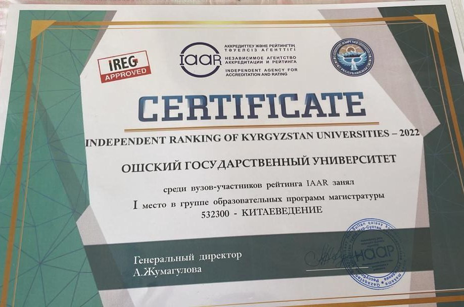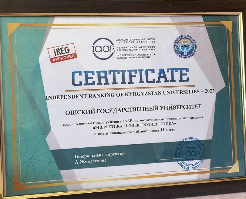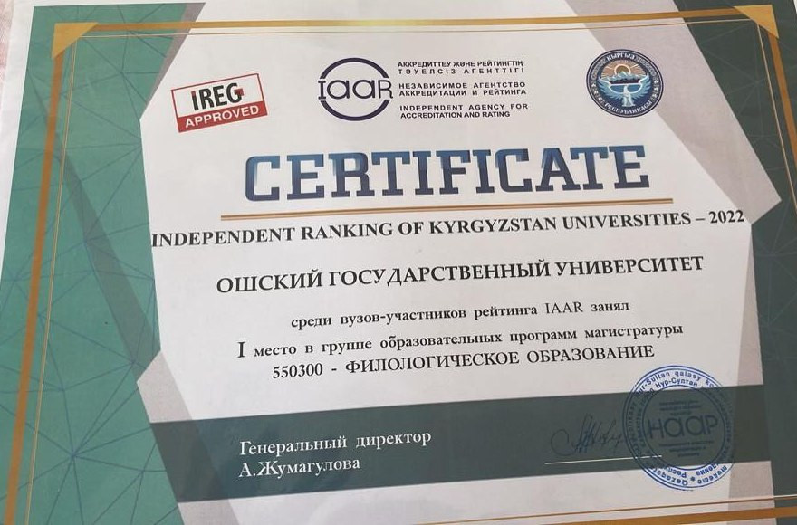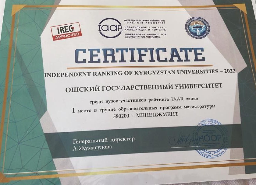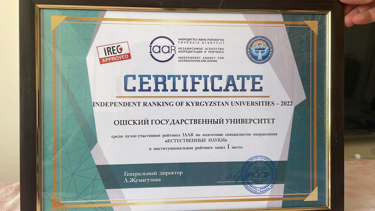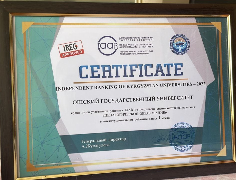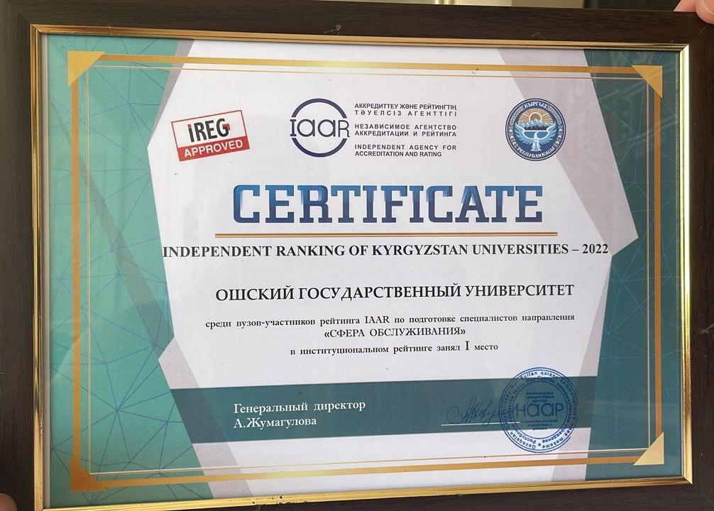 По итогам “Рейтинга вузов Кыргызстана -2022", проведенного независимым агентством аккредитации и рейтинга (НААР), в общем генеральном рейтинге ОшГУ занял первое место, за что университет удостоился сертификата и специальной статуэтки.