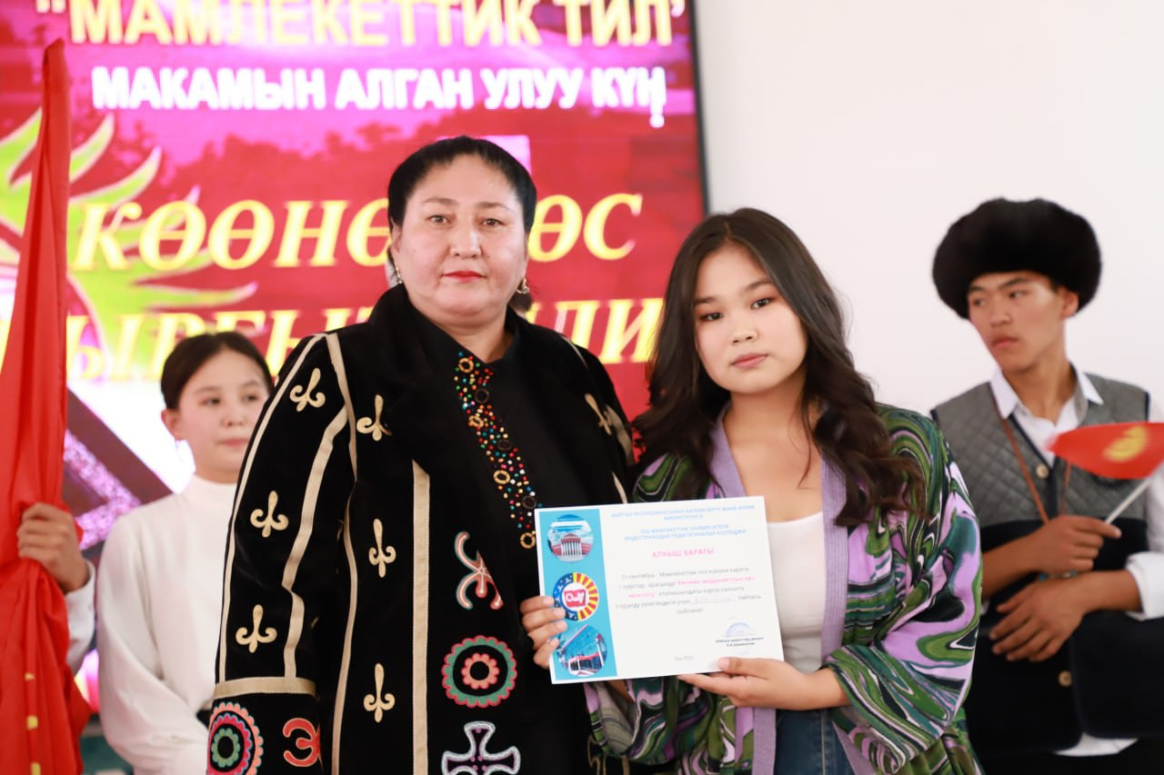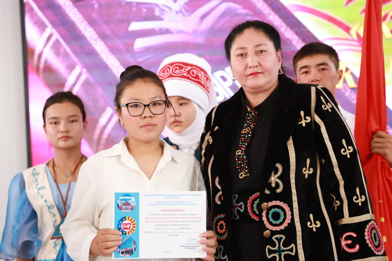 В индустриально-педагогическом колледже прошло мероприятие "Вечно живой кыргызский язык", на котором приняли участие проректор по государственному языку и социальной работе Мастура Шарипова, преподаватели и студенты колледжа. Студенты участвовали в конкурсе, представили национальные песни и танцы, инсценировки. В заключении были подведены итоги конкурсов национальных изделий и сочинений. Победители получили грамоты и призы от организаторов.