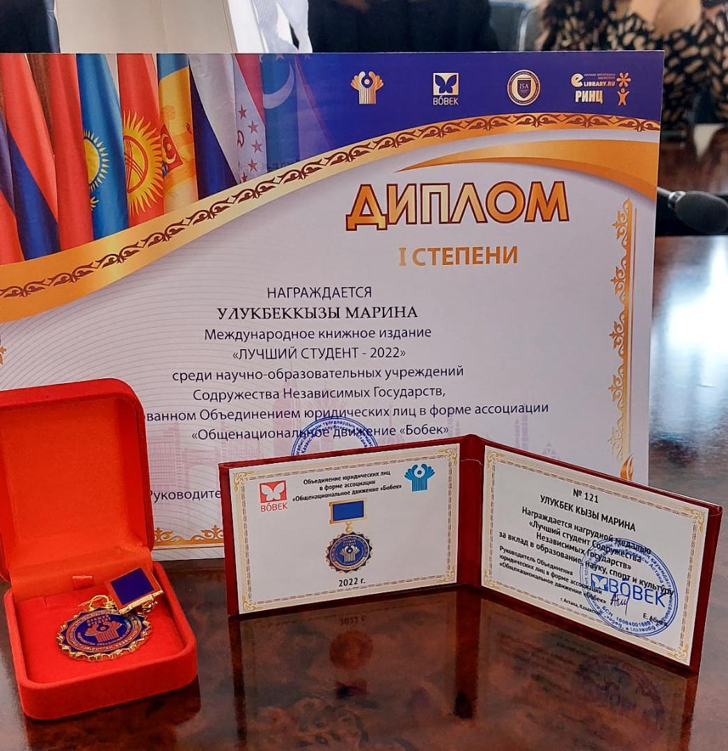 Магистрантка факультета БИМ ОшГУ Марина Улукбек кызы за достижения в образовании и науке, активное участие в общественной жизни удостоилась диплома 1 степени, медали "Лучший студент 2022" и удостоверения "Лучший студент СНГ".