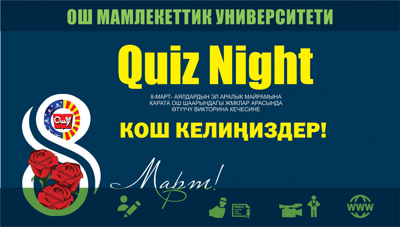 Накануне праздника в ОшГУ по инициативе ректора Кудайберди Кожобекова прошел вечер - викторина для журналистов города. На мероприятии, посвященной Международному женскому дню 8 Марта, приняли участие 8 команд из представителей СМИ города Ош.