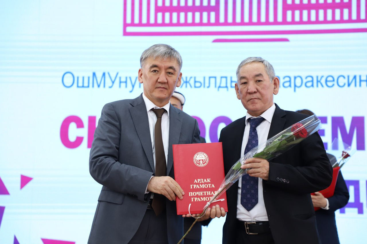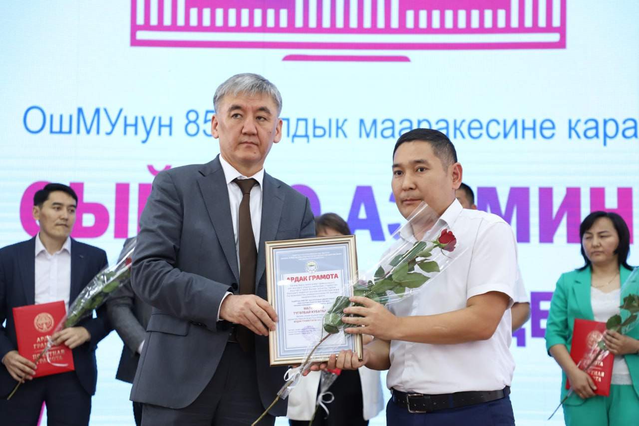ОшМУнун 85 жылдык мааракесине карата окуу жайда сыйлоо аземи болуп өттү. Салтанатта ректор Кудайберди Кожобеков университеттин өнүгүшүнө салым кошуп, билим берүү, илим изилдөө, саламаттыкты сактоо жаатында эмгек сиңирген, көп жылдан бери үзүрлүү эмгектенген профессордук-окутуучулук курамга, кызматкерлерге “ОшМУга эмгек сиңирген ишмер” төш белгисин, Ардак грамотасын, алкыш баракчасын, акчалай сыйлыктарын тапшырды. Ошондой эле мааракеге карата жиберилген Экономика жана коммерция министрлигинин, Эмгек, социалдык камсыздоо жана миграция министрлигинин, Ош облусунун, Ош шаардык мэриясынын, Ош шаардык Кеңешинин, Билим жана илим кызматкерлеринин кесиптик бирлигинин борбордук комитетинин, Ош облустук профсоюз комитетинин төш белгилерин, Ардак грамоталарын өз ээлерине жеткирди.