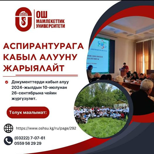 Прием документов в аспирантуру ОшГУ производится с 10 июля по 26 сентября 2024 г.