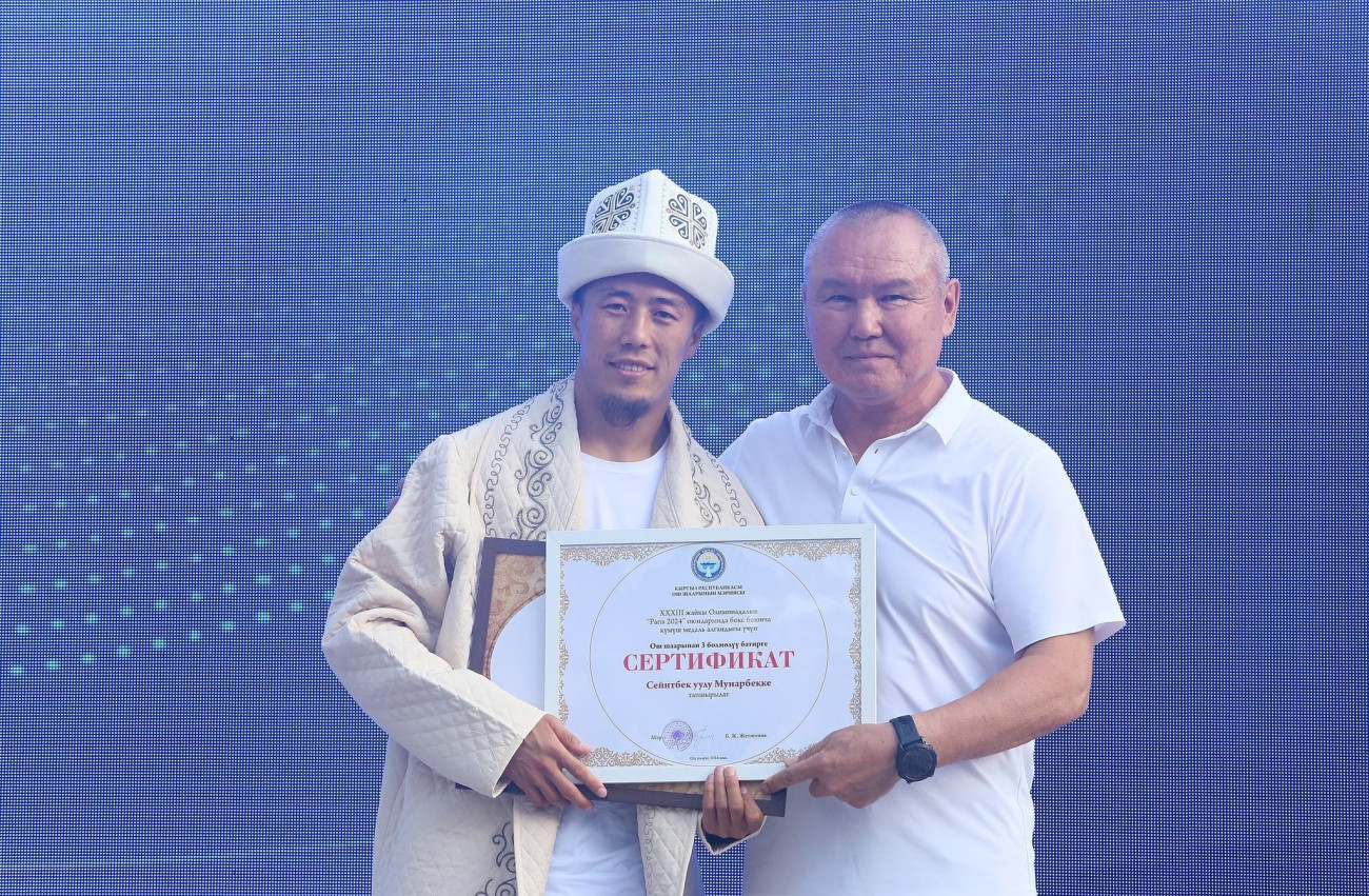 Местные органы власти, высоко оценив выступления спортсменов, вручили 1 млн сомов и ключи от 3-х комнатной квартиры Мунарбеку Сейитбек уулу и 500 тысяч сомов и ключи от 2-х комнатной квартиры его личному тренеру Беганасу Султанбаеву, а первый тренер боксера Турдалы Оморов удостоился приза 500 000 сомов.