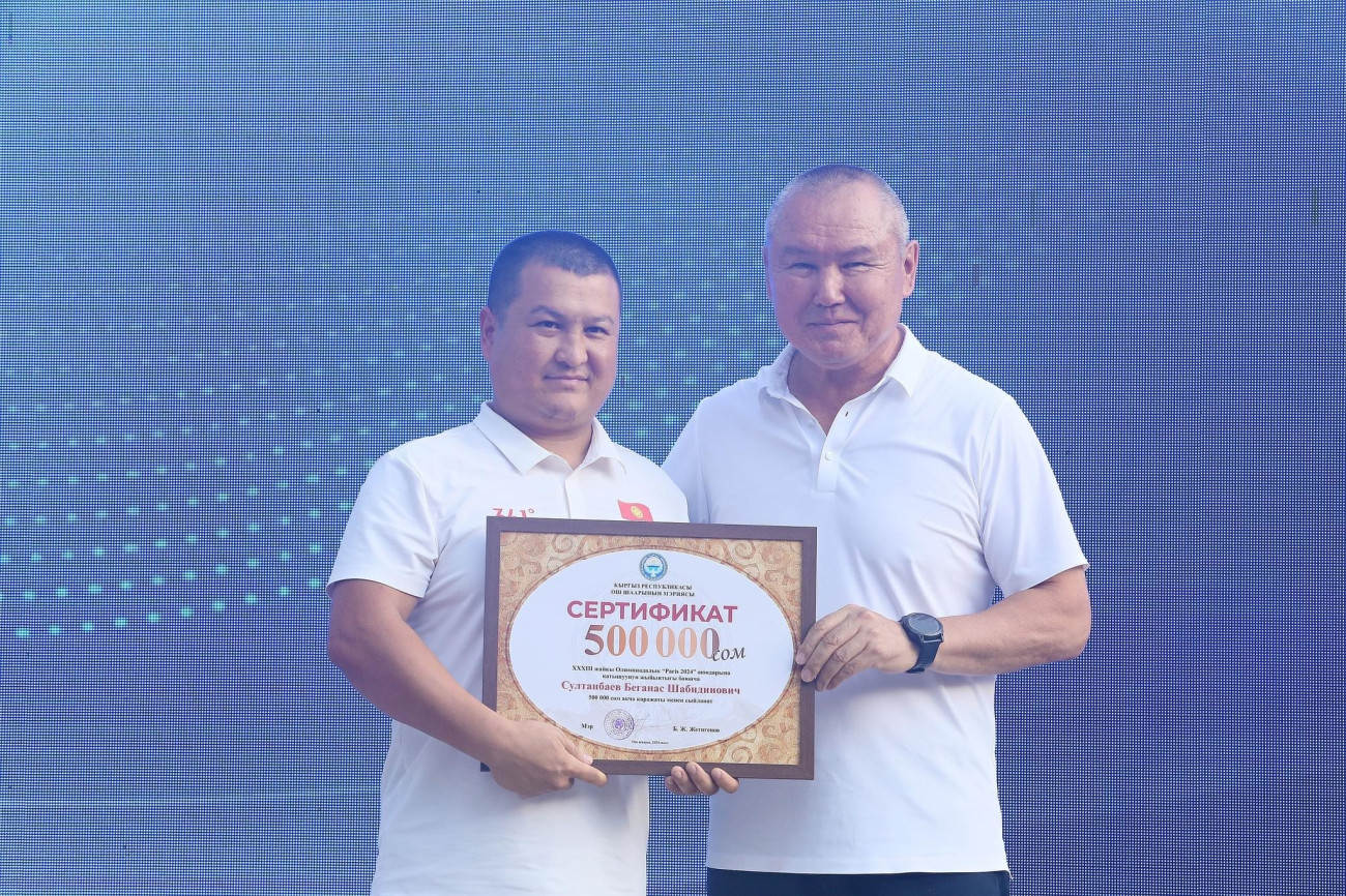 Наряду с этим вручили 1 млн сомов Акжолу Махмудову, 200 тысяч сомов его тренеру Мейрамбеку Ахметову, 250 тысяч сомов дзюдоисту Айбек уулу Кубанычбеку и 100 тысяч сомов его тренеру Бакыту Жусупову. Кроме того каждый участник олимпиады получил в дар по скакуну.