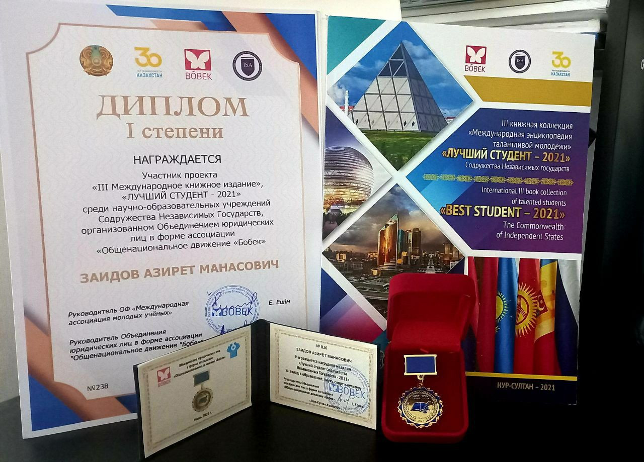 Конкурс, организованный в сфере образования, науки и спорта международным проектом "Бовек", проходил в столице Казахстана Нурсултане. Студент факультета востоковедения и истории Азирет Заидов принимал в конкурсе в онлайн режиме и удостоился диплома, нагрудного знака и публикации о нем в книге проректа "Лучший стуент СНГ 2021".