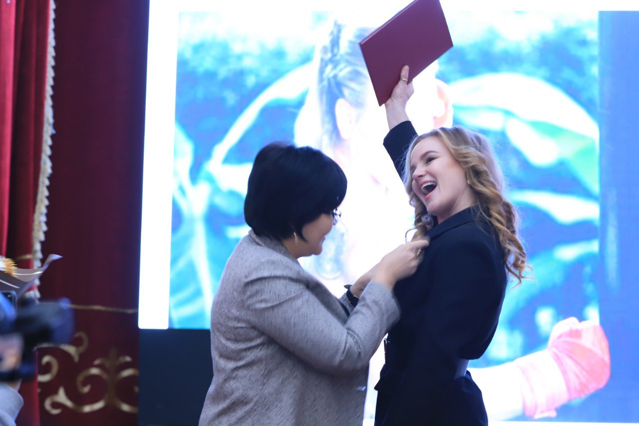 Спортсменке вручили памятную медаль ОшГУ.