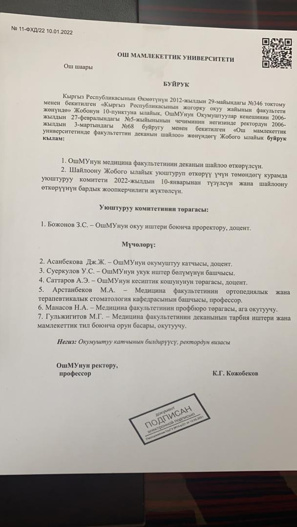 Согласно положения о выборе декана факультета Ошского государственного университета приказом ректора ОшГУ №11-ФХД/22 создан оргкомитет по организации и проведению выборов декана медицинского факультета.
