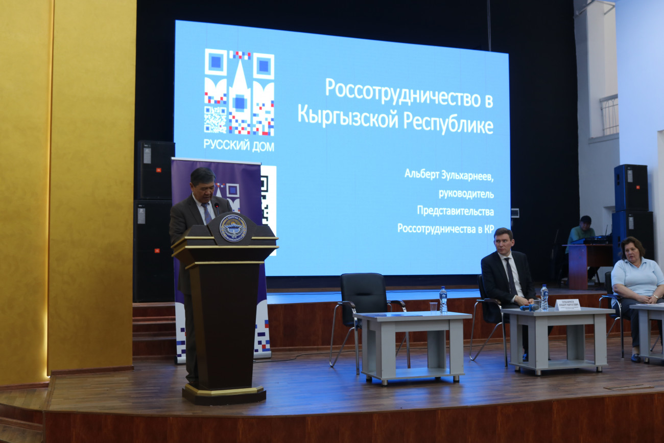 Rossotrudnichestvo temsilcileri ve Rusya Federasyonu'nun Kırgızistan Büyükelçiliği danışmanı Albert Zulharneev ve Rus dili ve Rusça eğitim teşviki proje küratörü Irina Tsareva OşDÜ’yü ziyaret etti.
