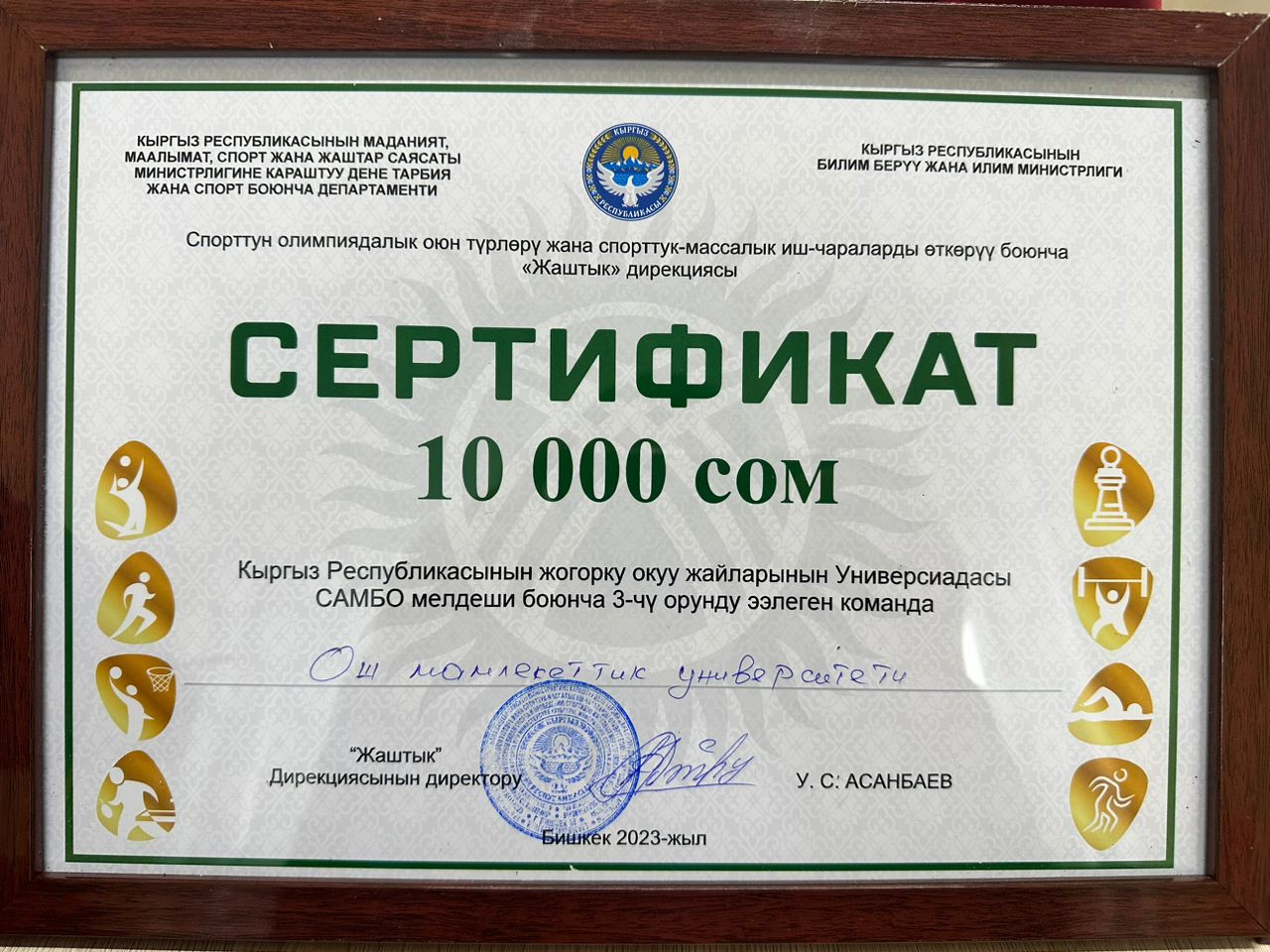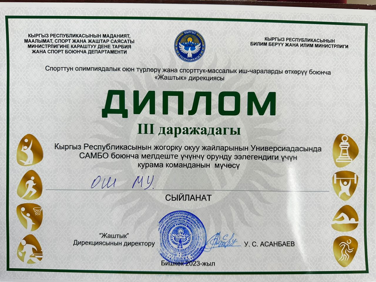 Kırgız Cumhuriyeti Üniversite Oyunları çerçevesinde gençler arasında düzenlenen sambo müsabakalarının sonuçları özetlendi. Oş Devlet Üniversitesi sambo takımı üçüncü olup diploma ve 10 bin som ile ödüllendirildi.