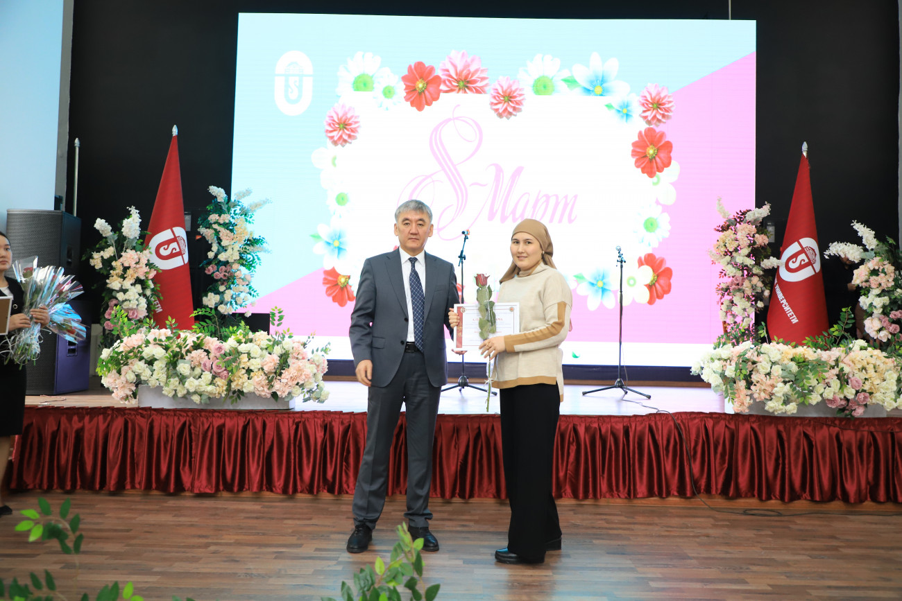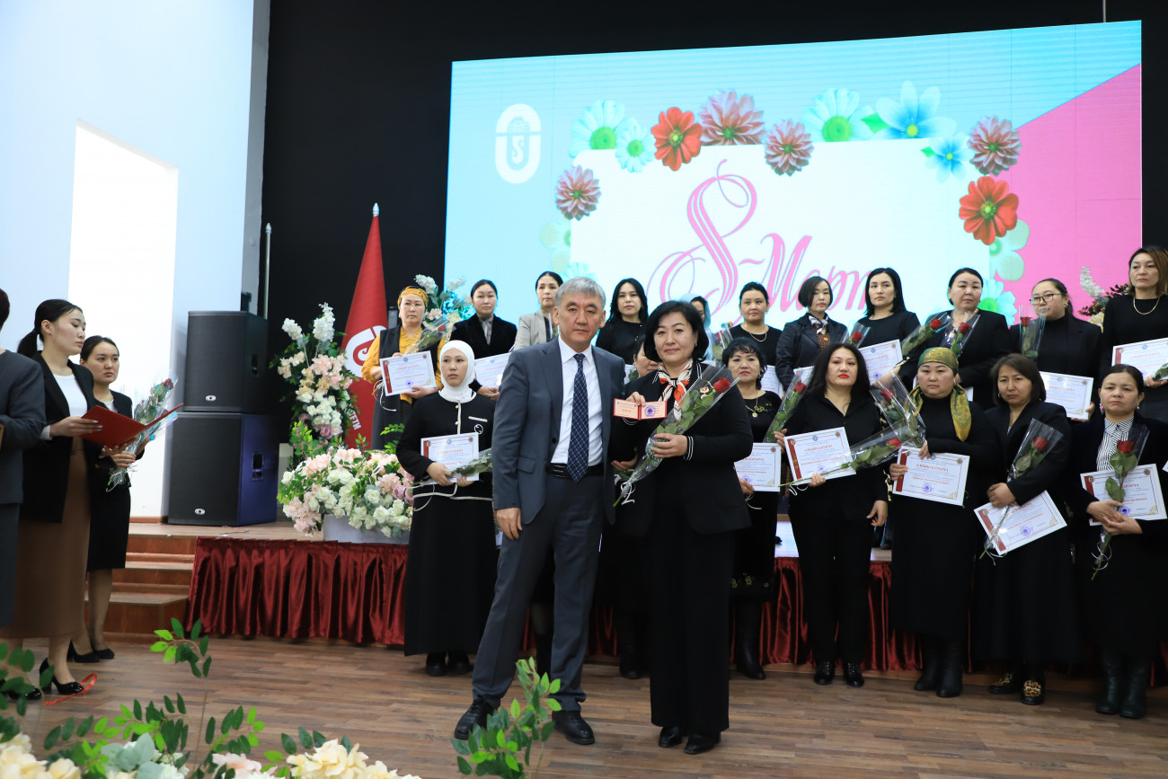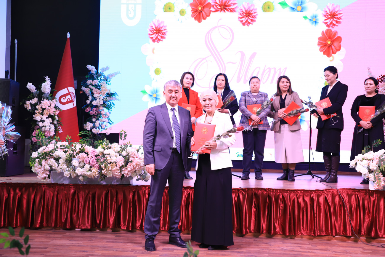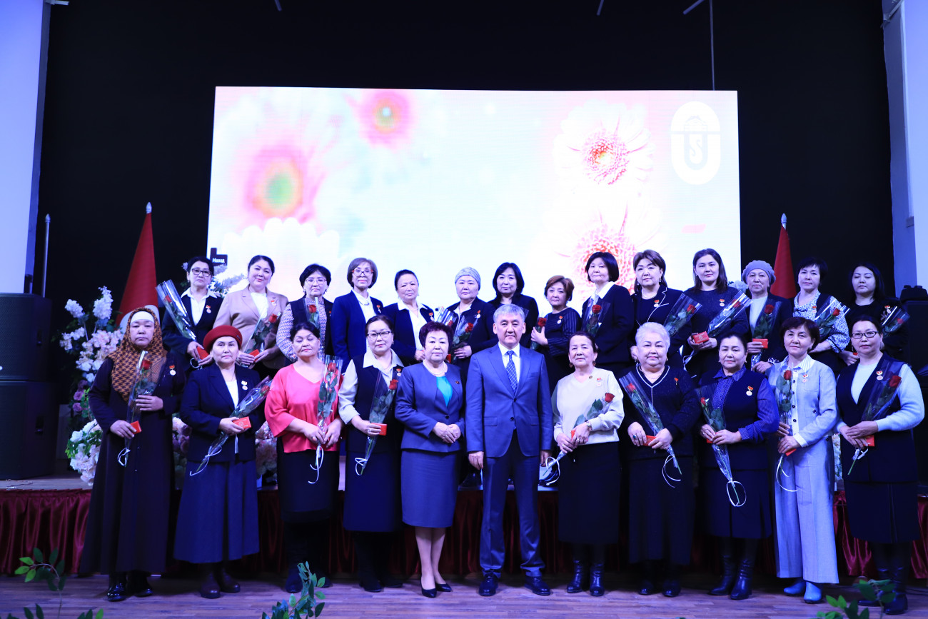 Etkinlikte Rektör Kudaiberdi Kozhobekov üniversitenin tüm beyleri adına tebriklerini iletti. Toplam öğretim üyelerinin yüzde 60’ının kadın olduğunu belirterek üniversitedeki kadınların aktif katılımını vurguladı. Dahası, üniversitedeki doktora derecesine sahip kişilerin neredeyse yarısının ve adaylarının yarısından fazlasının kadın olduğu, kadınların akademideki başarılarına ilişkin etkileyici istatistikler paylaştı. Özellikle 2023-2024 akademik yılında 23 gururlu kadın akademisyene ileri dereceler verilmiştir.