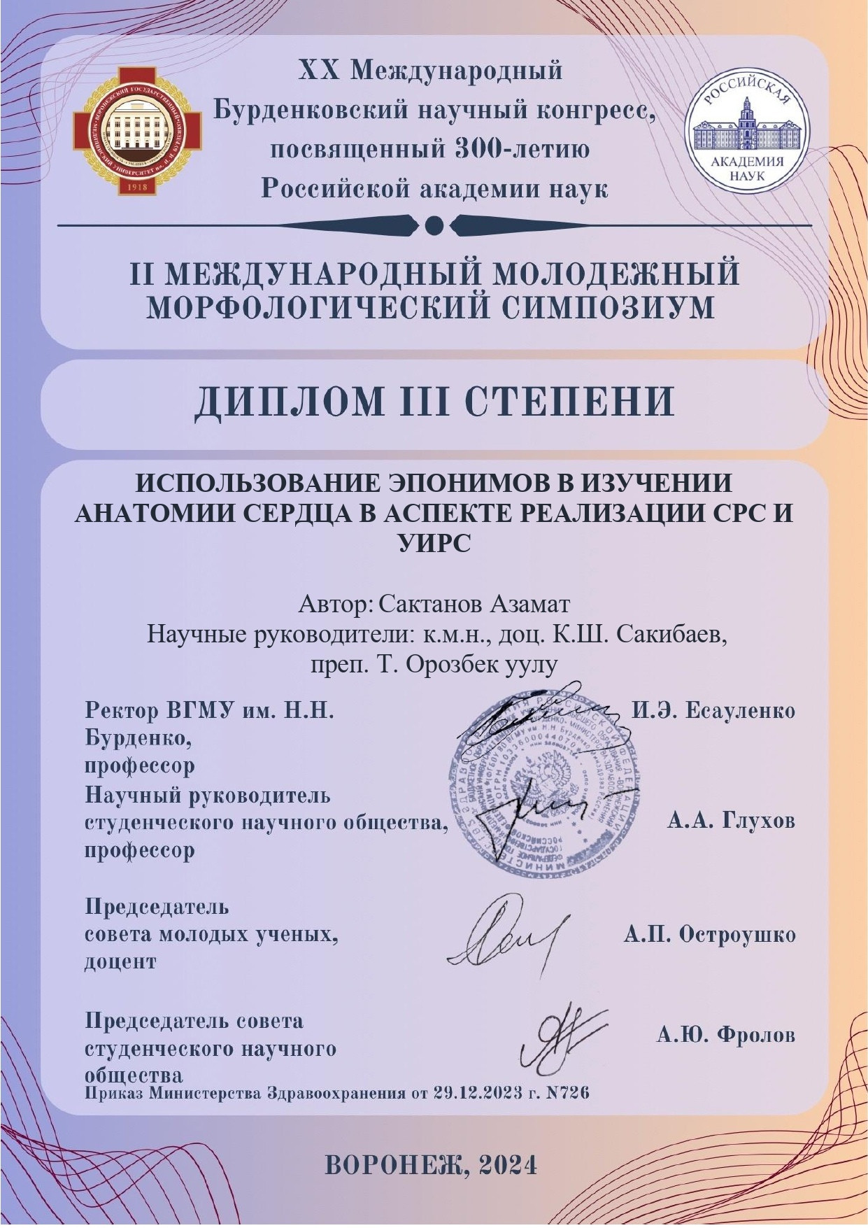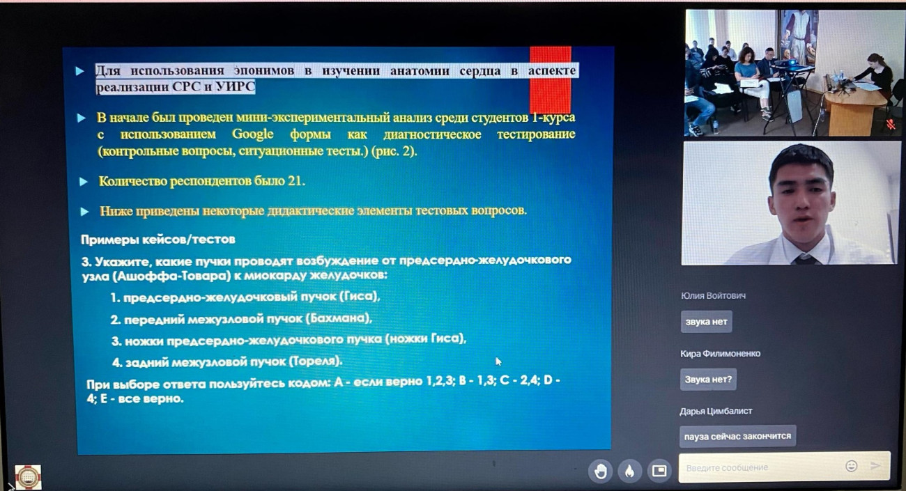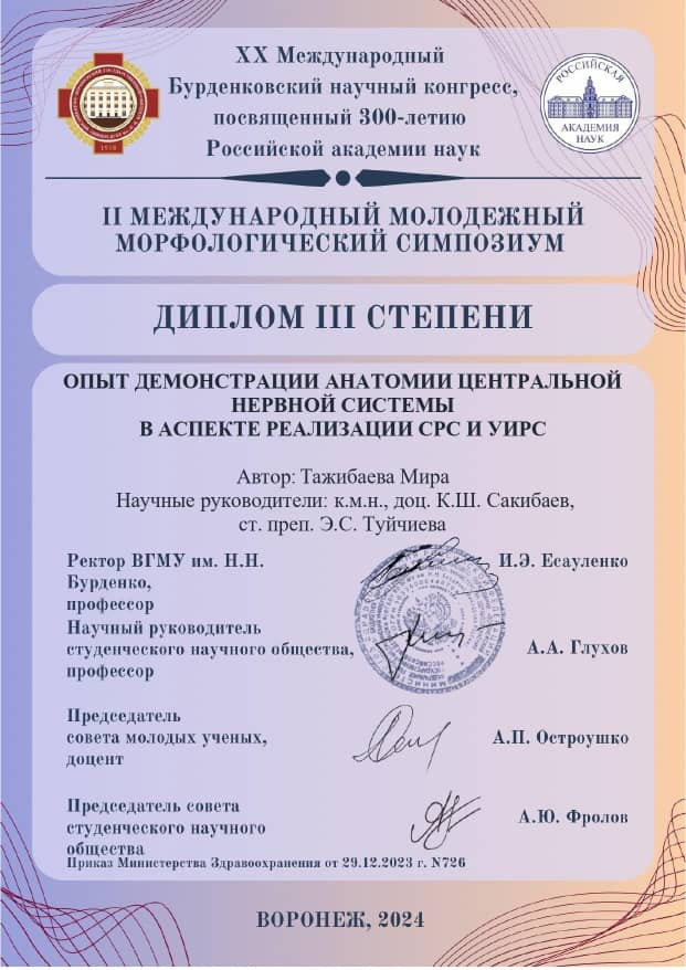 19 Nisan 2024'te Voronej'de, Rusya Bilimler Akademisi'nin 300. yıldönümüne adanan XX Uluslararası Burdenko Bilimsel Kongresi kapsamında II. Uluslararası Gençlik Morfoloji Sempozyumu düzenlendi. Oş Devlet Üniversitesi Tıp Fakültesi Anatomi Anabilim Dalı öğretim üyeleri ve öğrencileri çevrimiçi formatta katıldı.