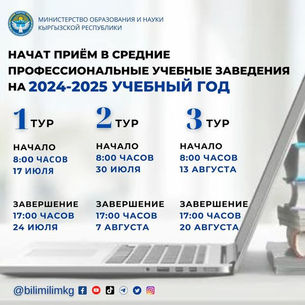Bugün, 17 Haziran, Kırgız Cumhuriyeti’ndeki orta mesleki eğitim kurumlarında 2024-2025 akademik yılı için ilk kabul turunun başlangıcını işaret ediyor.