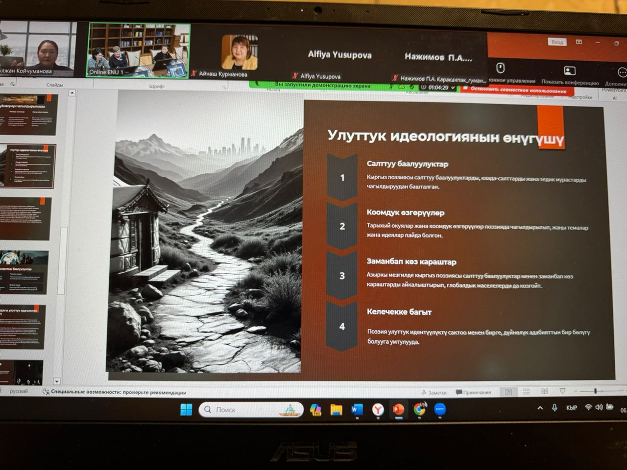 Oş Devlet Üniversitesi Filoloji ve Kültürlerarası İletişim Enstitüsü Kırgız Dili Bölümü doçenti Gulzhan Koichumanova, uluslararası bir bilimsel ve teorik konferansta Kırgız şiirindeki ulusal ideoloji ve kişisel dünya hakkında bir rapor sundu.