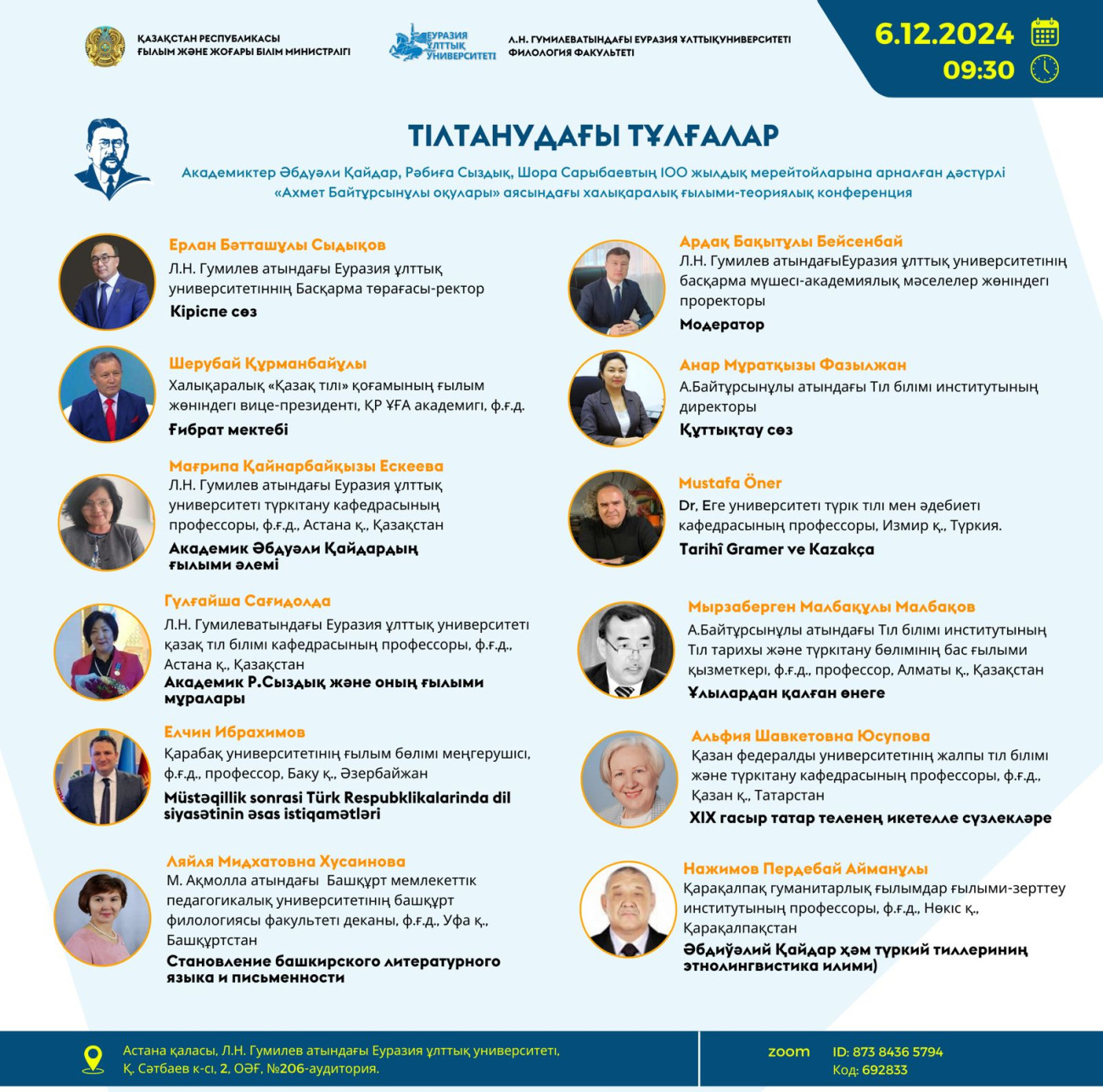 6 Aralık’ta L.N. Gumilyov Avrasya Ulusal Üniversitesi tarafından düzenlenen konferans, akademisyenler Abdulali Kaidar, Rabiga Syzdyk ve Shora Sarybaev’in 100. yıl dönümüne adandı.
