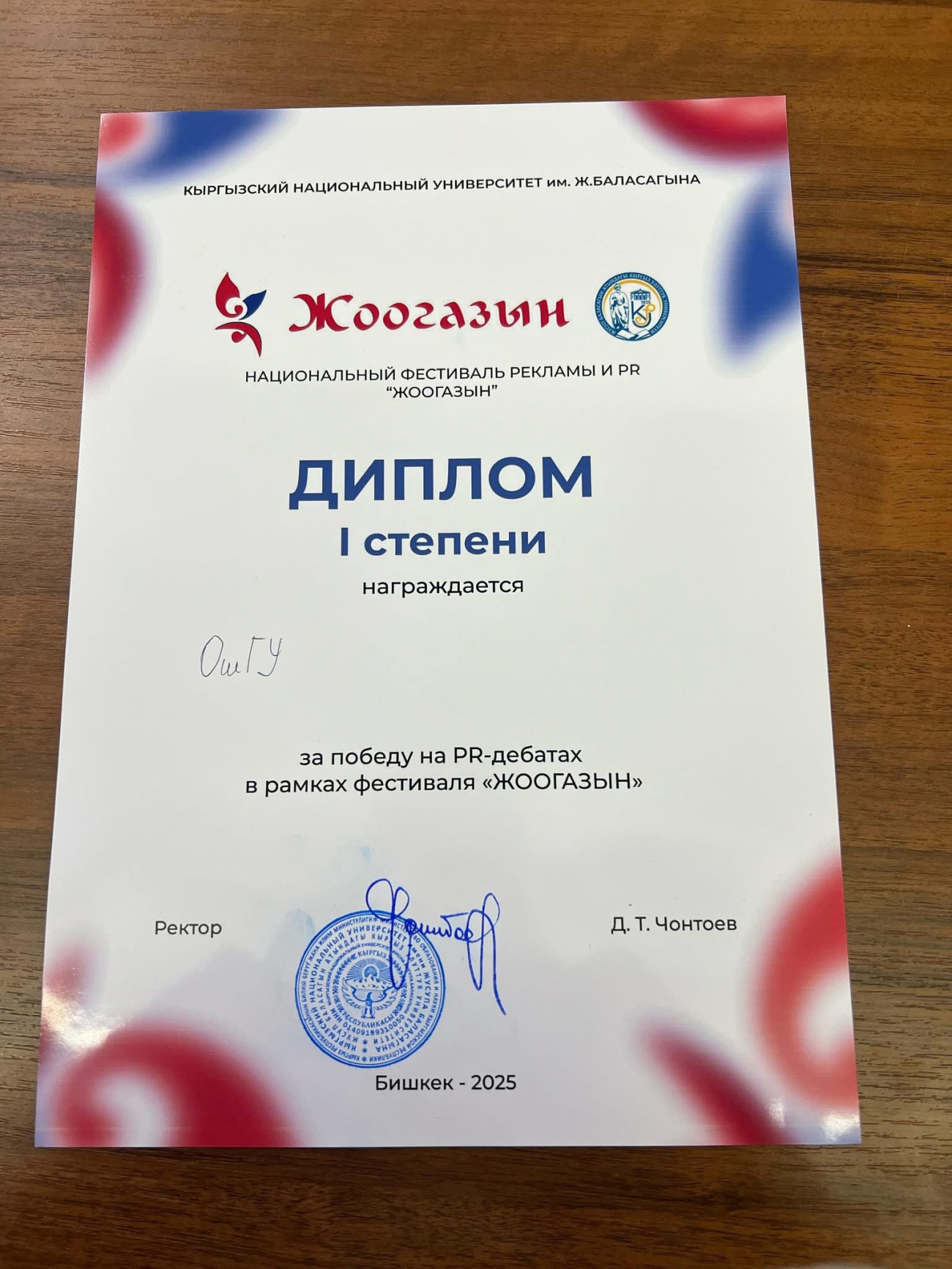 26-28 Mart tarihleri arasında, Kırgız Ulusal Üniversitesi’nin 100. yıl dönümüne adanmış ulusal reklam ve halkla ilişkiler festivali “Lale” Bişkek’te gerçekleşti. Etkinlik kapsamında, reklam ve halkla ilişkiler faaliyetleri üzerine tartışmada Oş Devlet Üniversitesi’nden öğrenci takımı 1. oldu.