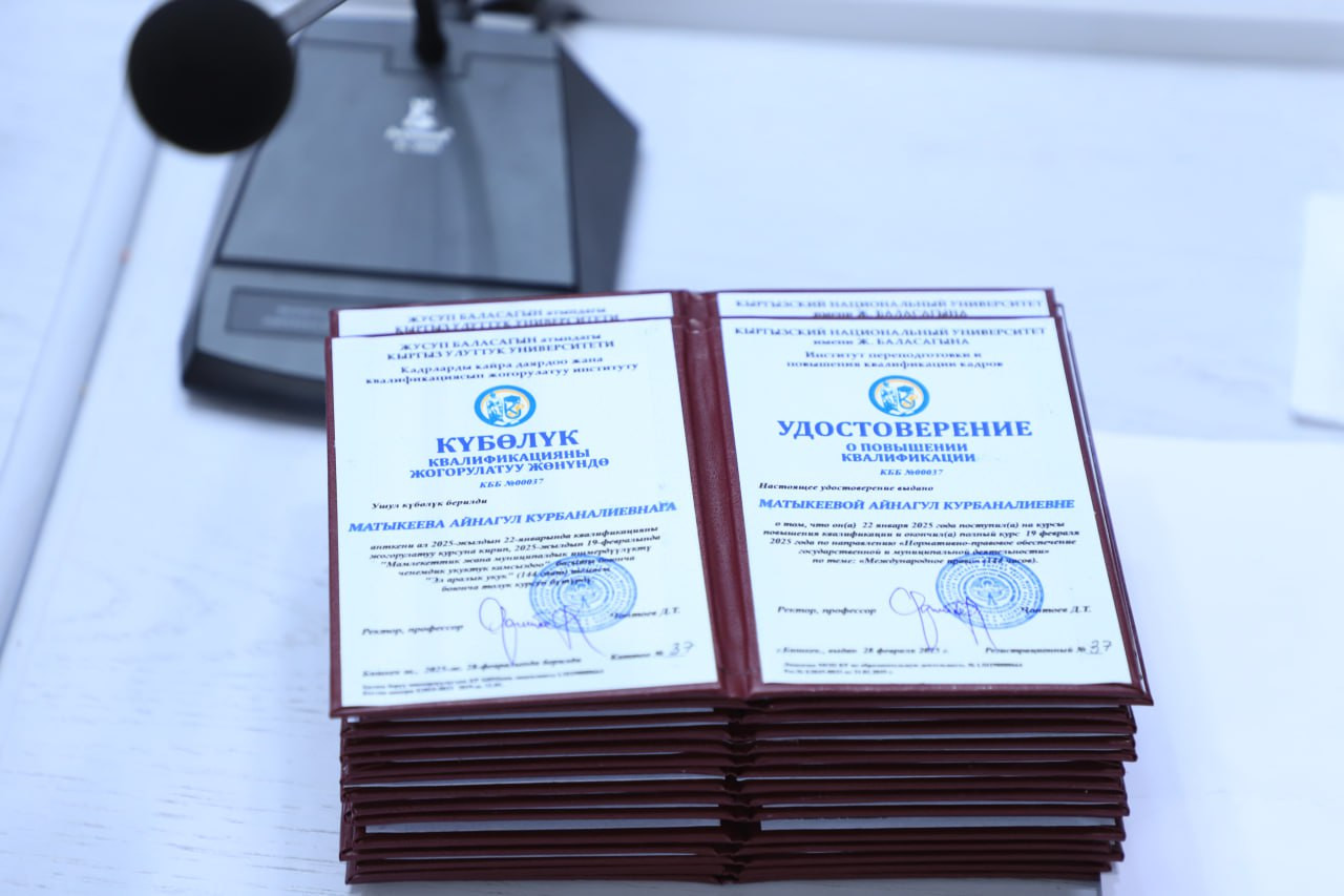 Ziyaretin bir parçası olarak, Oş Devlet Üniversitesi’nin 28 öğretim üyesi, Kırgız Ulusal Üniversitesi Personel Yeniden Eğitimi ve İleri Eğitim Enstitüsü’nde “Uluslararası Hukuk” üzerine ileri eğitim programını tamamladıkları için sertifika aldılar.