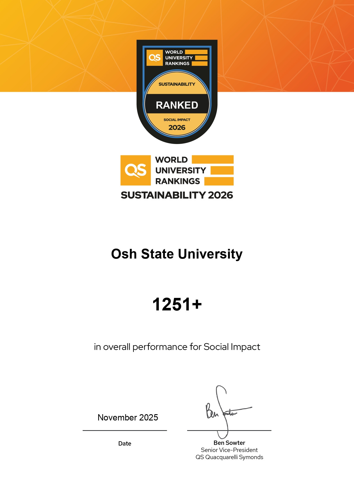 Рейтингге туруктуу өнүгүүгө бекем берилгендиги менен айырмаланган 2000 университет катышкан. Ош мамлекеттик университети (ОшМУ) курчап турган чөйрөгө жана коомго тийгизген таасири үчүн 1251-орунду, башкаруу багыттары боюнча 1107-орунду алды. Бул көрсөткүчтөр менен жалпы окуу жайлардын арасында 1501-орунду ээледи. Мында университеттин аткарып жаткан иш аракеттери атайын бааланган.