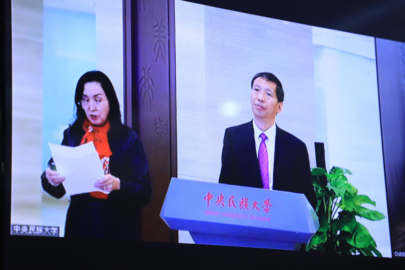 ОшМУ менен Пекиндеги Борбордук улуттар университетинин ортосунда “Кыргыз-кытай гуманитардык алмашуу борборунун” ачылуу аземи 14-октябрда онлайн байланыш аркылуу өттү.