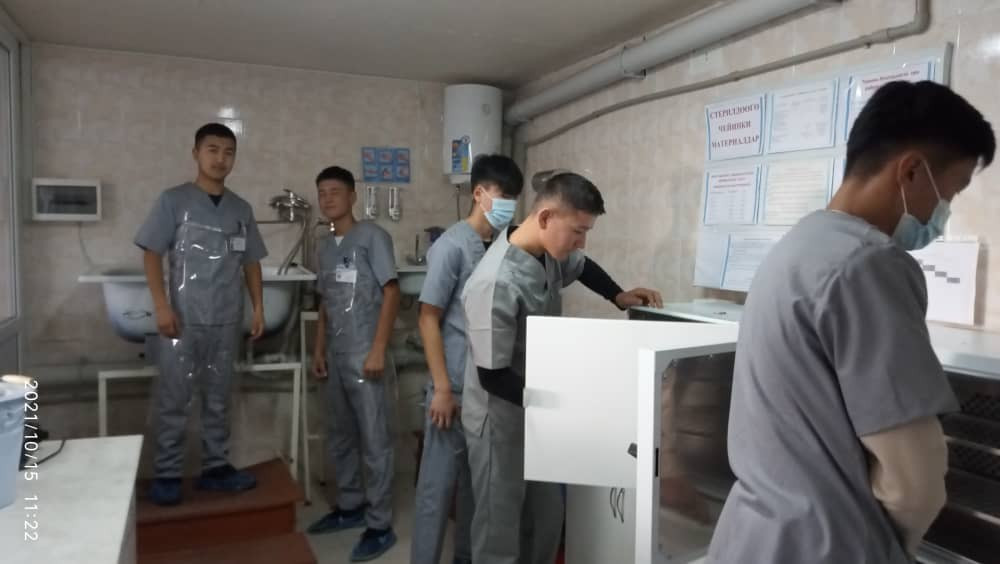 Мында медициналык техникаларды тейлөө графиги түзүлүп, студенттер окутуучусунун жетекчилиги астында текшерүүдөн өткөрүп жатышат. Натыйжада, 2 электрофорез Поток1, 1 электрокардиограф QZ-1203G, 1 УВЧ аппарат жана 1 тренажёр оңдолду, 2 стерилизатор, 1 дисцилятор тейленип клиникага тапшырылды.